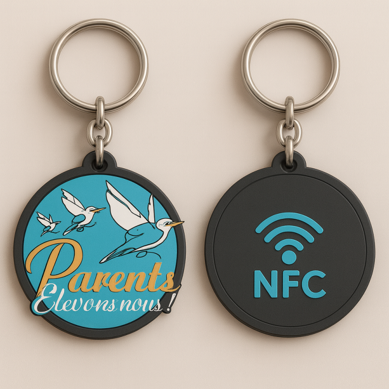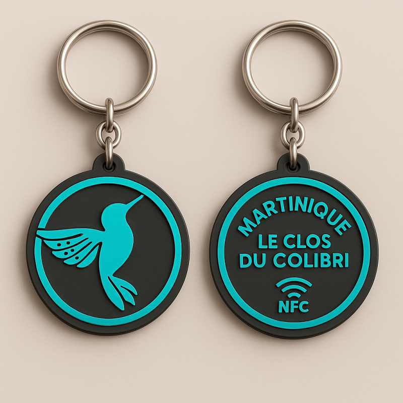 Réalisation sur mesure pour la maison d’hôtes Le Clos des Colibris en Martinique : un porte-clé personnalisé intégrant une puce NFC, permettant aux visiteurs d’accéder facilement à leur carte de visite virtuelle et à leurs informations en ligne.